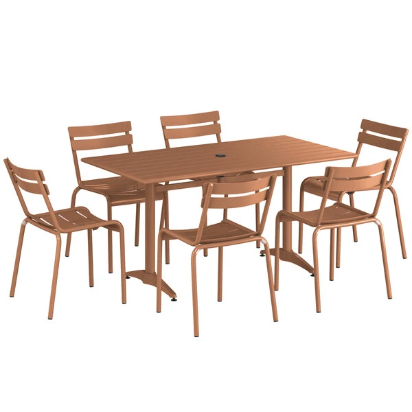 Lancaster Table & Seating 32″ X 60″ Brown Powder-Coated Aluminum Dining Height Outdoor Table With Umbrella Hole And 6 Side Chairs