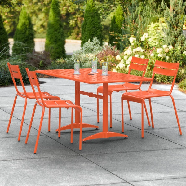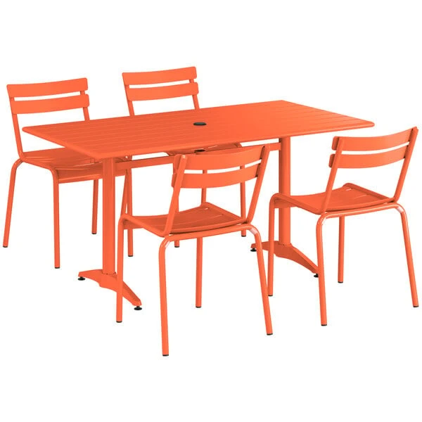 Lancaster Table & Seating 32″ X 60″ Orange Powder-Coated Aluminum Standard Height Outdoor Table With Umbrella Hole And 4 Side Chairs