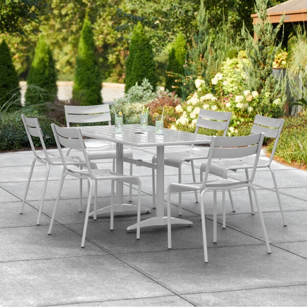 Lancaster Table & Seating 32″ X 60″ Silver Powder-Coated Aluminum Dining Height Outdoor Table With Umbrella Hole And 6 Side Chairs