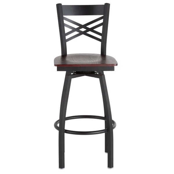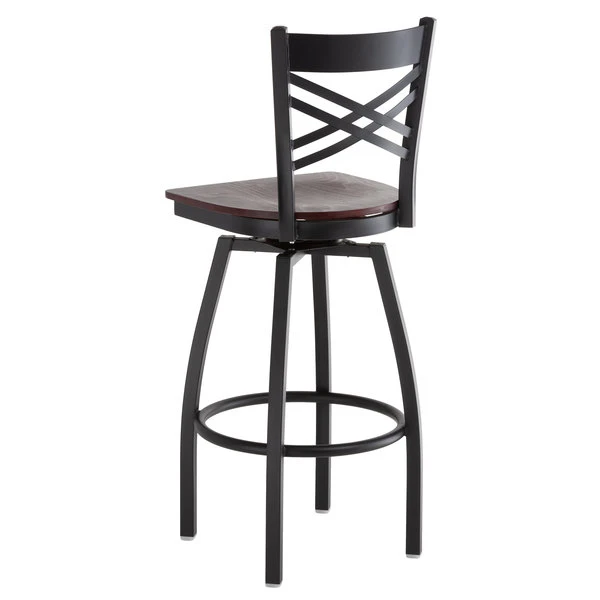 Lancaster Table & Seating Black Finish Cross Back Swivel Bar Stool With Mahogany Wood Seat
