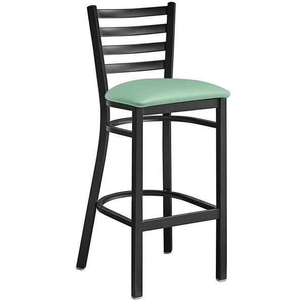 Lancaster Table & Seating Black Finish Ladder Back Bar Stool With 2 1/2″ Seafoam Vinyl Padded Seat