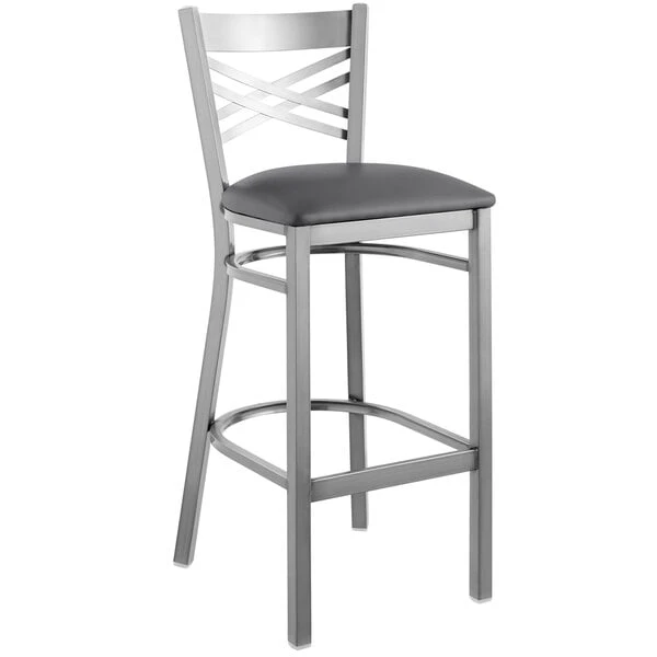 Lancaster Table & Seating Clear Coat Finish Cross Back Bar Stool With 2 1/2″ Dark Gray Vinyl Padded Seat