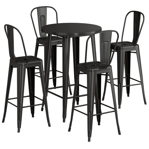 LT&S Alloy Series Lancaster Table & Seating Alloy Series 30″ Round Black Outdoor Bar Height Table With 4 Metal Cafe Bar Stools