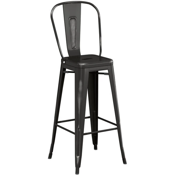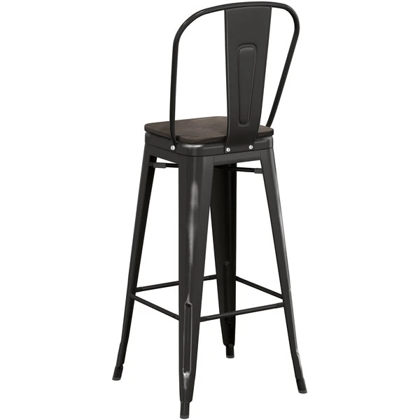 LT&S Alloy Series Lancaster Table & Seating Alloy Series Distressed Black Metal Indoor Industrial Cafe Bar Height Stool With Vertical Slat Back And Black Wood Seat