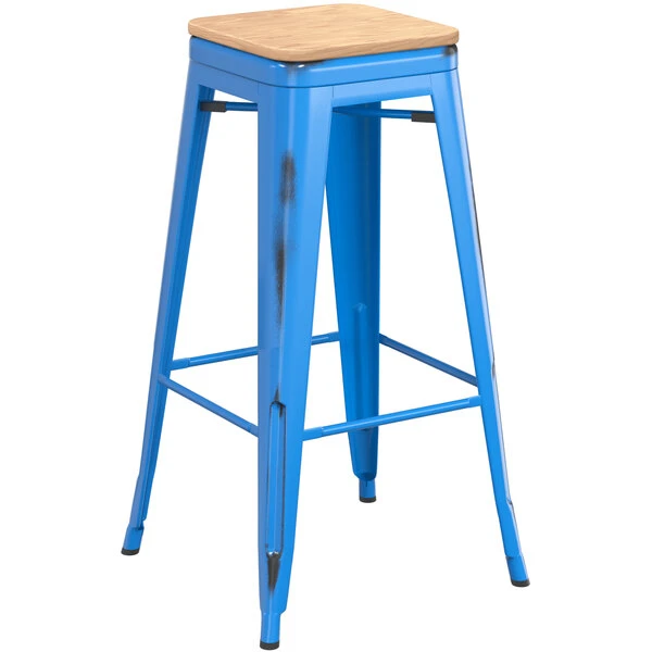 LT&S Alloy Series Lancaster Table & Seating Alloy Series Distressed Blue Stackable Metal Indoor Industrial Barstool With Natural Wood Seat