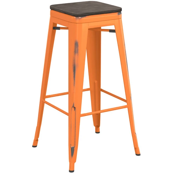 LT&S Alloy Series Lancaster Table & Seating Alloy Series Distressed Orange Stackable Metal Indoor Industrial Barstool With Black Wood Seat