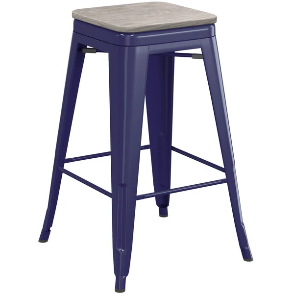 LT&S Alloy Series Lancaster Table & Seating Alloy Series Navy Metal Indoor Industrial Cafe Counter Height Stool With Gray Wood Seat