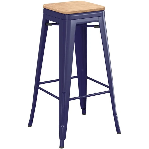 LT&S Alloy Series Lancaster Table & Seating Alloy Series Navy Stackable Metal Indoor Industrial Barstool With Natural Wood Seat