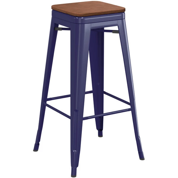 LT&S Alloy Series Lancaster Table & Seating Alloy Series Navy Stackable Metal Indoor Industrial Barstool With Walnut Wood Seat