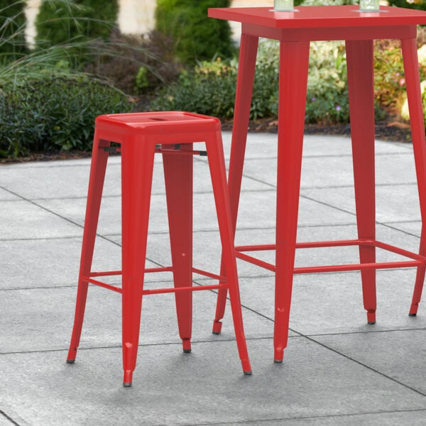 LT&S Alloy Series Lancaster Table & Seating Alloy Series Red Stackable Metal Indoor / Outdoor Industrial Barstool With Drain Hole Seat