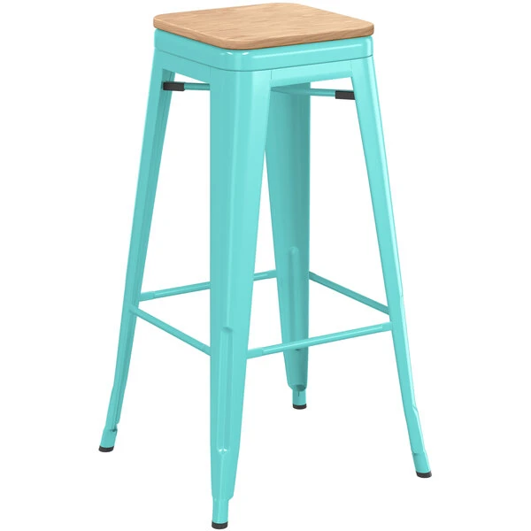 LT&S Alloy Series Lancaster Table & Seating Alloy Series Seafoam Metal Indoor Industrial Cafe Bar Height Stool With Natural Wood Seat