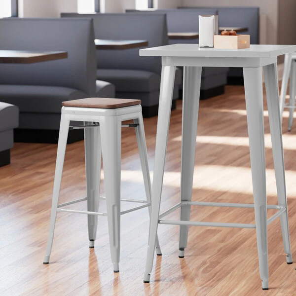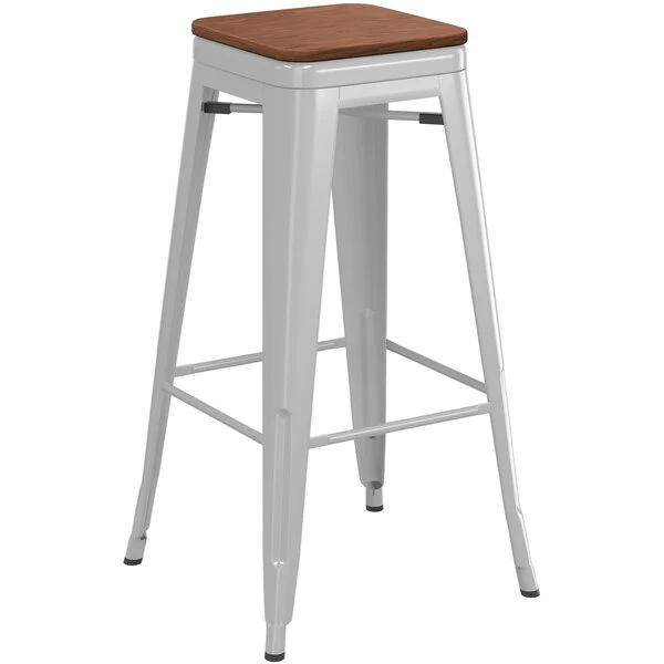LT&S Alloy Series Lancaster Table & Seating Alloy Series Silver Metal Indoor Industrial Cafe Bar Height Stool With Walnut Wood Seat