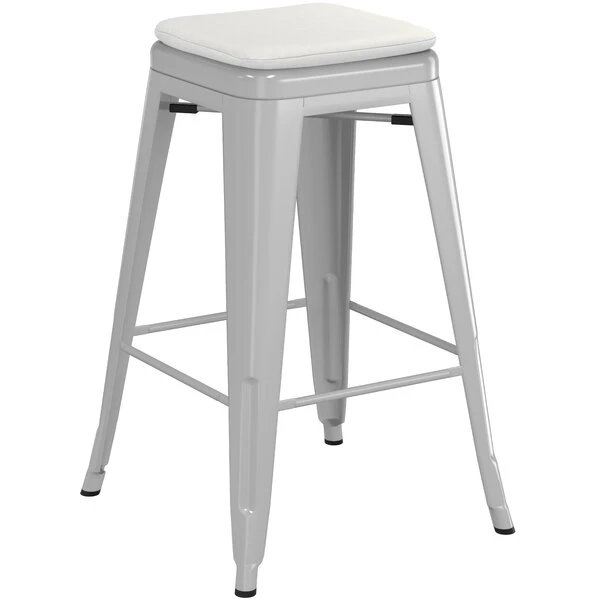 LT&S Alloy Series Lancaster Table & Seating Alloy Series Silver Stackable Metal Indoor / Outdoor Industrial Cafe Counter Height Stool With Gray Fabric Magnetic Cushion