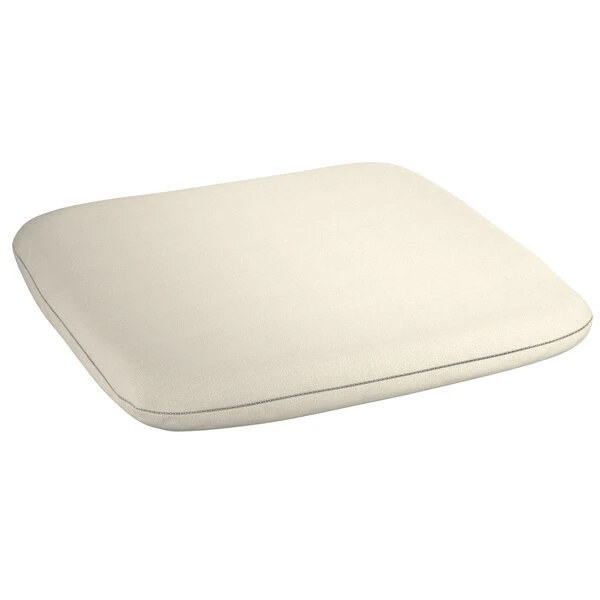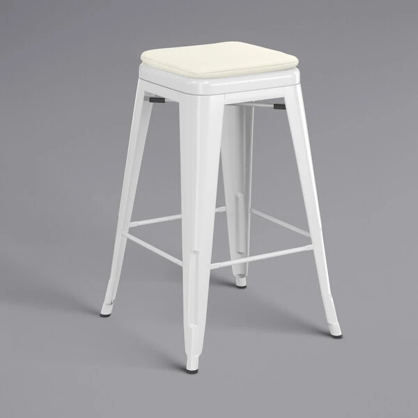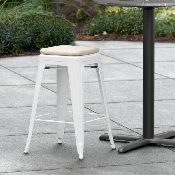 LT&S Alloy Series Lancaster Table & Seating Alloy Series White Stackable Metal Indoor / Outdoor Industrial Cafe Counter Height Stool With Tan Fabric Magnetic Cushion