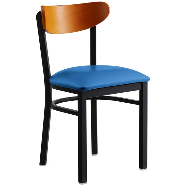 LT&S Boomerang Series Lancaster Table & Seating Boomerang Black Finish Chair With 2 1/2″ Blue Vinyl Padded Seat And Cherry Wood Back