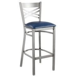 Lancaster Table & Seating Clear Coat Finish Cross Back Bar Stool With 2 1/2″ Navy Vinyl Padded Seat